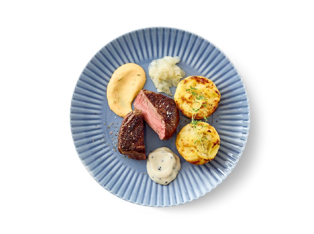 Oksemørbrad med tomatisret bearnaisesauce, kartoffelgratin, cremet blomkåls pure´ med nigellafrø og revet sylted skorzonerrod.