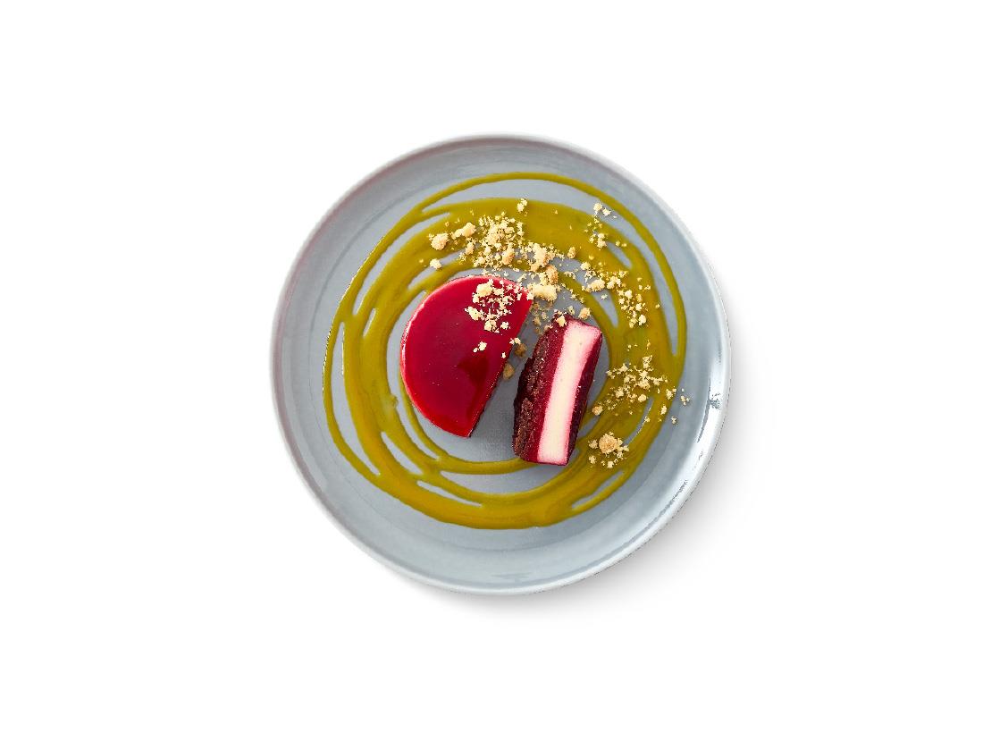 Dessertkage med passionsfrugtmousse overtrukket med hindbærglace.